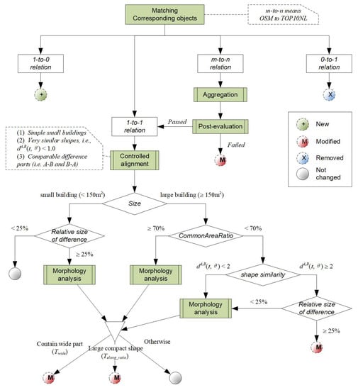 In this paper, we identified several measurable factors for change analysis that can properly handle boundary mismatch, LOD differences, generalization, and non-systematic offset that exist between datasets and are commonly encountered in current database update scenarios. In our case, OpenStreetMap was used to update professional data, so changes were derived by comparing the two. Specifically, data matching, aggregation of the many-to-many correspondence, controlled alignment, and morphology analysis of difference parts were identified as important factors and integrated for our change detection. The rules and operations were parameterized and organized in a directed acyclic graph structure, which is different from a typical decision tree.