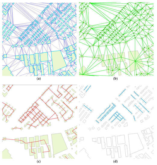 Steps in recognizing the building alignments: (a) computing Delaunay triangulation (DT) on building footprints, (b) derived proximity graph, (c) pruned proximity graph, and (d) recognized alignments.