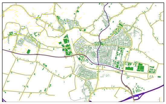 Sample area of our datasets (Geldermalsen, NL) consisting of city centers, urban, suburban, rural, and industrial/commercial regions. For clarity, only OSM buildings are shown in green.