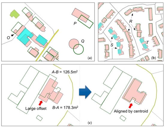 First, we used CommonAreaRato ≥ 15% for object matching, which was relaxed from the value of 30% that was previously used [5,24] (Section 2.2). Without this relaxation, pairs O, P, and Q in Figure 12a could not be matched because of the large offset. Because O, P, and Q are simple shapes, they were aligned by our algorithm to reduce their apparent difference and were classified as unchanged (true negatives). With the basic method (based solely on sizes of difference parts) in Table 1, however, they were classified as changed (false positives). As the positional discrepancy was pervasive and could not be corrected by geo-referencing, errors resulted from the basic geometric analysis. The basic method reduced the number of false negatives (high recall) at the risk of including more false positives (low precision).