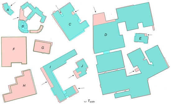 Now, we look into some details of the morphology analysis (Section 2.3.4) in Figure 13. Here, the difference parts in A, C, and E are the smallest, even smaller than those of F, G, and H. Our morphology analysis was able to identify that F, G, and H were unchanged, as the skeleton width of their parts was less than Twidth (e.g., 5 m in the presented results) and the elongation ratio was very low. Many long and thin-belt parts in other buildings in Figure 13 were identified using the same process. This was useful for further identifying where the expansion or contraction occurred (e.g., arrows in Figure 13).