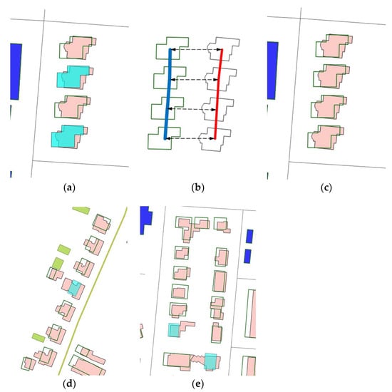 Demonstration of how the building pattern constraint is used to correct inconsistent results: (a) inconsistent change detection; (b) alignments are well kept in both datasets; and (c) corrected result. (d,e) cases where the correction does not play a role (see text for explanation).