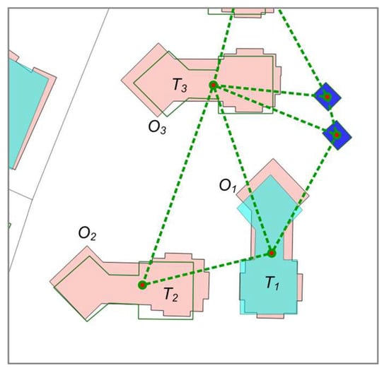 As illustrated in Figure 15, T1 was classified as ‘changed’ (a false positive). When compared with its surrounding cases, this inconsistency was the result of small geometric variations. First, the turning function value between O1 and T1 was 1.2, so they were not aligned to reduce the apparent difference. Then, it could not be corrected by the alignment constraint as the buildings were not in any alignment. Here, we propose the following idea: if a situation is very similar to its neighbors, the result among the similar neighbors can be cross-validated for inconsistency correction. Specifically, the turning function value among T1, T2, and T3 was about 0.012, and that between O1, O2, and O3 was about 0.19, which means that situations ⟨O1, T1⟩, ⟨O2, T2⟩, and ⟨O3, T3⟩ were nearly identical. Then, along a similar line of thought as in Section 3.2.3, T1 can be corrected and re-assigned as ‘unchanged’. This shows another way where contextual information can play a role. We think that greater usage of contextual information can be identified in change detection when presented with more diverse data.