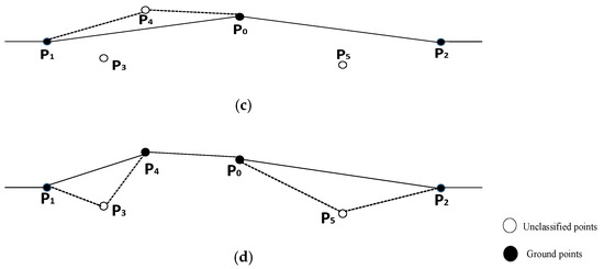 In this mode, if a point satisfies the densification threshold, this point is added to the constructed TIN, and the TIN is updated. As shown in Figure 2a, we assume that points 05 are ground points and present the true ground surface. In the initial stage of filtering, points 1 and 2 are selected as seed points and points 0, 3, 4, and 5 are the unclassified ground points, as shown in Figure 2b. Since the calculated distance and angle from point 0 to the facet are below the iterative densification threshold, point 0 will be added to the TIN and the TIN is updated. We continue to densify the TIN, and then point . 4 is accepted by the TIN, as shown in Figure 2c. When the number of points added into the TIN increases, the distance between the projected point of the newly added unclassified ground point and the vertices of the facet become small. The calculated angle will become larger than the given angle threshold due to the influence of the standard variance. Hence, the unclassified ground points 4 and 5 are rejected in the process of iterative densification. Similarly, if we hope that all unclassified ground points can be added to the TIN, the angle threshold should become larger.