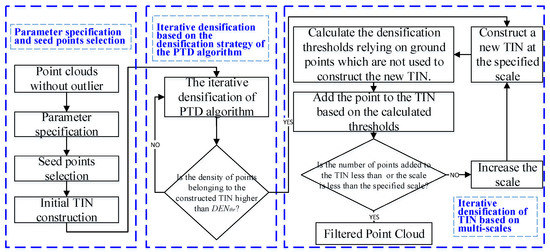 Based on the analysis in Section 2.4, this paper proposes an improved PTD algorithm considering the density and standard variance of point clouds. Figure 3 shows the entire workflow of the revised PTD algorithm. In Figure 3, the improved PTD algorithm mainly consists of three steps: (1) parameter specification and seed point selection; (2) iterative densification based on the densification strategy of the PTD algorithm; and (3) iterative densification of TIN based on multi-scales.