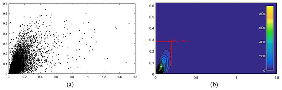 Figure 5. Illustration of selecting densification thresholds: (a) the distribution of ground points which don’t construct the TIN on the threshold plane; (b) the generated contour map. - Divide the two-dimensional planar into grids according to the specific size and calculate the number of points within each grid.