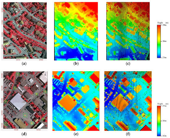 The test data in two areas: test area 11 ((a) orthoimagery; (b) dense image matching (DIM) point clouds; and (c) ALS data); and test area 32 ((d) orthoimagery; (e) DIM point clouds; and (f) ALS data).