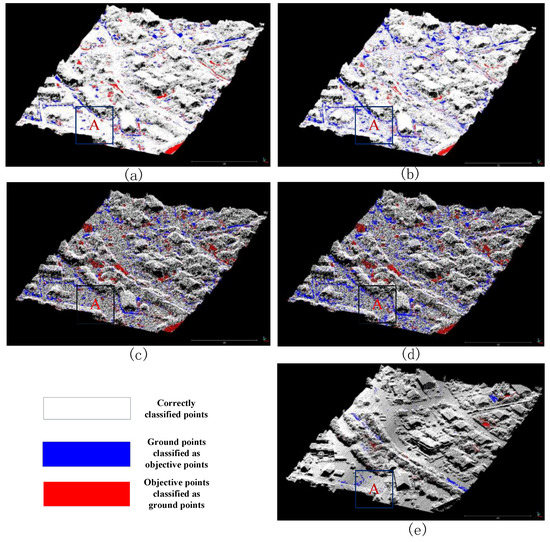 Filtering results of different types of point clouds in test area 32: (a) the filtering results of the proposed method for the DIM point clouds; (b) the filtering results of the PTD method for the DIM point clouds; (c) the filtering results of the proposed method for the rarefied DIM point clouds; (d) the filtering results of the PTD method for the rarefied DIM point clouds; (e) the filtering results of the PTD method for the ALS point clouds.