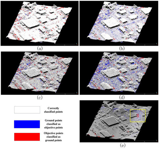 Compared with the PTD algorithm, the improved algorithm increases the type II errors slightly. This is mainly because the angle threshold increases in the process of the iterative densification of TIN based on multi-scales in our proposed method. Although the type II errors increase in our proposed method, these errors have little effect on the generation of DSM. This is mainly because the change of distance threshold becomes small in the process of the iterative densification of TIN based on multi-scales. As shown in Figure 11, the distribution of wrongly classified objective points is almost the same in both the PTD algorithm and improved PTD algorithm. The added wrongly classified objective points of the improved PTD algorithm are still within the region where the wrongly classified objective points of the PTD algorithm are located. The improved PTD algorithm only densifies these regions by the larger angle threshold. Hence, our proposed method has a huge advantage in dealing with point clouds with high density and standard variance.