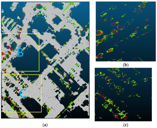 The distribution of type II errors of the PTD algorithm and improved PTD algorithm: green points are wrongly classified objective points in the PTD method and red points are wrongly classified objective points in the improved PTD method. In test area 32: (a) the entire distribution of objective points wrongly classified as ground points; and (b,c) the corresponding region of yellow rectangle labeled in (a).