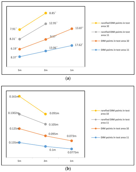 Since the number of points added to TIN is less than 2000 in the second iterative densification stage of the proposed method for the rarefied DIM point clouds when the scale is , the angle value and distance value is absence when the scale is . Figure 12 shows that the distance value becomes smaller and the angle value becomes larger when the density of the points added to TIN is greater than thr. This change is in agreement with the description in Section 2.4.