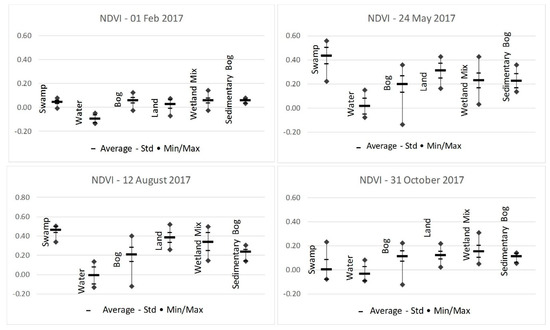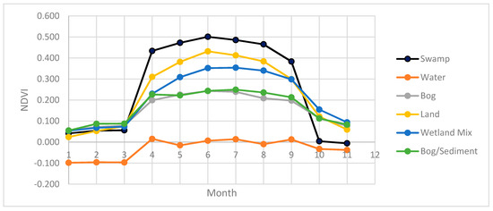As it can be seen from the NDVI results, every class taken into consideration in this study has different characteristics. As expected, the values of the water class are below or around zero. After March, when the leaf-on season begins, the NDVI value of the water class it is slightly above zero, indicating the presence of vegetation in the water. The NDVI value changes stay around zero depending on the water level until September, when the leaf-off season starts and the values drop below zero. The other five classes also tend to have low NDVI values at the beginning of the year, start to rise after March and stay stable until September, when the leaf-off season starts and the NDVI values drop. Swamps have the highest NDVI values generally varying from 0.4 to 0.6 in the leaf-on season. In the leaf-off season, NDVI value is close to zero and varying from slightly below zero to 0.2. The NDVI value of the Bog class can vary from −0.2 to 0.4 which makes is the most unstable wetland class in this study. The reason for this is the complex structure of Bogs, which contain soaked dry vegetation, wetlands, and shallow open water area. The NDVI values of the land class are much similar to the Swamp class, reaching the maximum NDVI value in July of 0.43. Similar to Bogs, the Wetland Mixture class defined in this study has a very complex structure. However, Wetland Mixture has higher NDVI values in the leaf-on season. Since there is the presence of small open water bodies, the NDVI values vary from slightly below zero to 0.3. The last class, Sediment Bog, is similar to the Bog class with the main difference of the land structure. While the land structure of Bog is formed of land, in the Sediment Bog the land is formed out of white sediment deposits formed over the years.