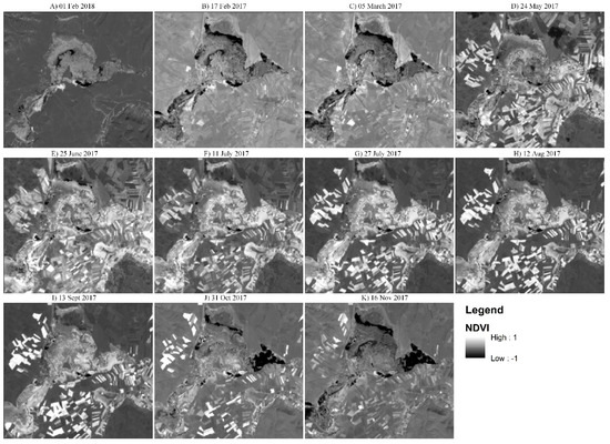 The pattern of NDVI time series has been closely analyzed in order to demonstrate its sensitivity in vegetation growth dynamics and its relation with LST and SAR data. As it is known, NDVI values vary from −1 to +1, where values smaller than 0 are classified as non-vegetated areas such as man-made objects, or water areas. Since in the study area no man-made objects were present, values lower than 0 were considered to be water areas. Values higher than 0 can be classified into three classes; values from 0–0.2 are considered to be bare lands, values from 0.2–0.4 are considered to be a mixture of land and small vegetation or unhealthy vegetation, while values higher from 0.4 are considered to be healthy vegetated areas. In