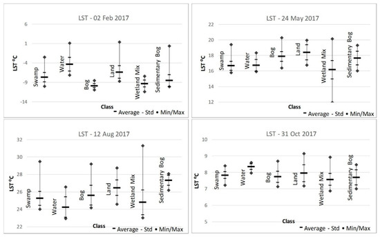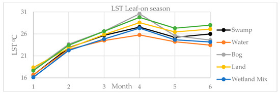 21]. The Water class has the highest temperature in the leaf-off season, and lowest in the leaf-on season. The full LST results are presented in