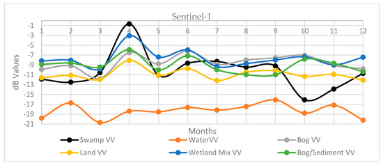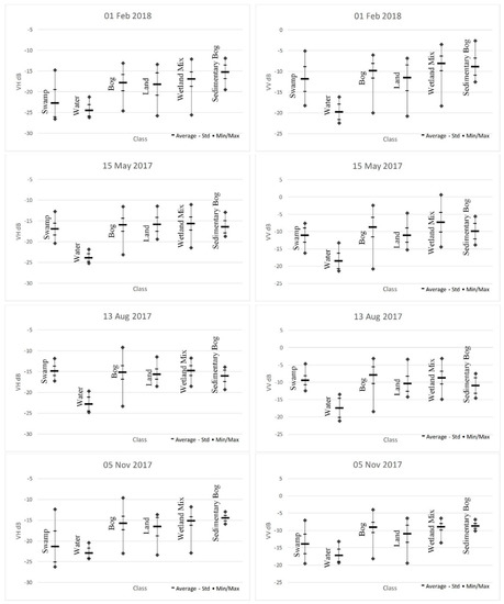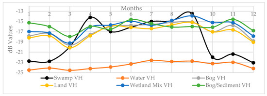Figure 9. While the backscatter values of the water class, as expected, do not change much over the months, the other classes’ values vary depending on the vegetation growth. Thus, the values of the swamp class starts to rise up in March at the beginning of the leaf-on season and then drastically falls in October at the beginning of the leaf-off season. In the leaf-off season, the swamps are generally open water bodies, which explain the similar backscatter values with the water class. The other class values are similar to each other. However, the land class has the lowest backscatter values through the year except for August and September, when the bog/sediment class has the lowest values. The detailed comparison between the classes can be seen in