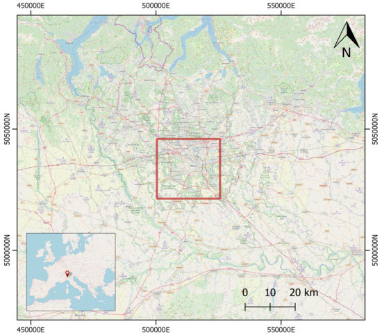 The analysis framework developed within this study is tested on the city of Milan (Northern Italy). Milan is located in one of the most densely populated European regions, the Padana Plain (see Figure 1), affected by poor wind circulation and high urbanization which favour the stagnation of pollutants as well as the persistence of a historically well-known UHI [28]. This makes Milan a suitable test area to investigate the influence of land cover on local air temperature that is the primary goal of the proposed analysis.