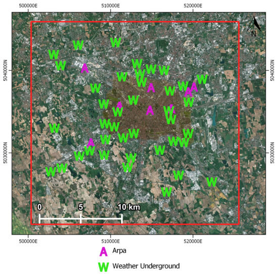 For this study, additional weather stations are considered in order to increase the spatial coverage of temperature observations over the study area. This is due to the need of investigating the correlation between temperature observations and LCZ at a very local scale, i.e., taking into account the likely point-wise nature of the two phenomena and their possible cause-effect relationship (see Section 3). The additional observations are collected from the Weather Underground (WU) platform [36]. This is an Internet service providing weather observations collected from both private and public weather stations from all over the world. Being based on a crowdsourced data collection strategy, information is delivered with no quality standard certification. Weather observations are publicly shared through the Weather Underground API, which allows requesting data at no cost for non-commercial purposes and within the limits expressed by the API provider. Because of new company policies, starting from June 2018 WU is no longer providing free API keys. All the data used in this study was acquired before this policy change. WU temperature time series for the stations of interest in Milan are downloaded in comma-separated values (CSV) format using a custom JavaScript collector module developed by the authors. The collected series refer to the period 1 January to 31 December 2016. Temperature measures from both ARPA and WU are available with a sub-hourly frequency. Stations locations are also retrieved and organized in a separate table linked with the time series CSV table for both data sources. The distribution of ARPA and WU stations providing temperature observations in Milan is depicted in Figure 2. The satellite basemap clearly shows that the stations in the South and South-West sides of the study area are mainly located in rural or not heavily urbanized areas.