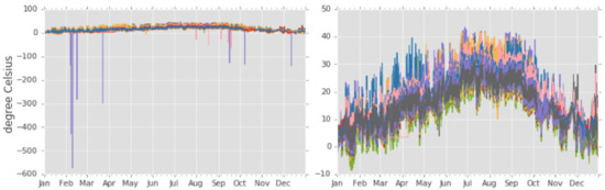 Example of temperature time series for the Year 2016 from Weather Underground stations in Milan before (left) and after (right) the cleaning and smoothing procedures. Coarse outliers (left) are clearly removed from the data set (right).