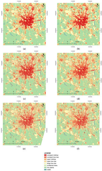 LCZ final maps: (a) Landsat 8, non-vegetative period; (b) Landsat 8, vegetative period; (c) Sentinel-2, non-vegetative period; (d) Sentinel-2, vegetative period; (e) RapidEye, non-vegetative period; (f) RapidEye, vegetative period. CRS: WGS84/UTM zone 32 N.