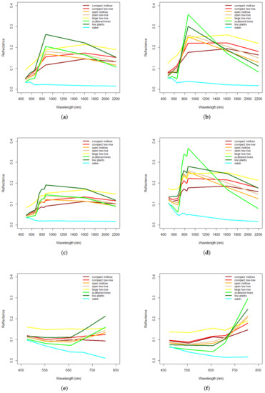 Spectral signatures of the 8 different LCZ classes: (a) Landsat 8, non-vegetative period; (b) Landsat 8, vegetative period; (c) Sentinel-2, non-vegetative period; (d) Sentinel-2, vegetative period; (e) RapidEye, non-vegetative period, (f) RapidEye, vegetative period.