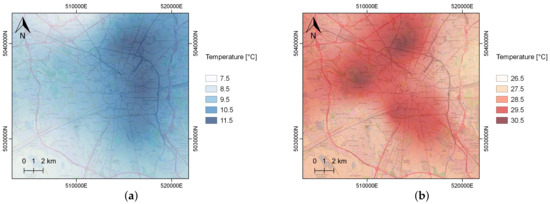 Temperature maps were derived from the air temperature observations by interpolating the station measures using Kriging [57]. Ordinary Kriging was performed through an R script based on the gstat package [58], available from the QGIS Processing Toolbox. Interpolated maps provided a better understanding of the air temperature patterns in the city of Milan. These allowed to explore evidence and features of the Milan UHI. A qualitatively assess of the actual goodness for the temperature series adopted was also achieved. In fact, the series provided a reasonable feedback in describing both spatial and temporal temperature patterns in the city. The presence of a significant UHI in the North-Eastern area of the city is clearly outlined in Figure 7, especially during the non-vegetative period. Conversely, during the vegetative period the UHI is less clustered while remaining more intense around the city center.