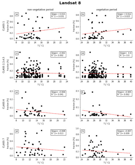 By observing the scatter-plots in Figure 8, Figure 9 and Figure 10, it can be argued that the contribution of highly urbanized areas, such as the one expressed by the Class 1 fractions, is always positive on the air temperature. This is true for any satellite imagery and time period considered. The contribution of the collapsed Classes 2, 3, 4, and 5 shows almost no correlation evidence with air temperature. Regarding classes 6 and 7, a sensible negative correlation is detected in almost all the cases. Besides a general low linear correlation between the two variables that is expressed by the coefficient of determination () computed for each graph, regression lines show comparable trends by considering the same LCZ class and time period for different satellites. The different spatial and spectral resolutions of the different satellite imagery seems not to have a significant influence on this exploratory experiment. The results show how temperature patterns are connected with the land cover type that is a well known effect, also reported in literature [59]. Nevertheless, the data used in this example, as well as the analysis strategy adopted, would benefit from a further improvement in order to conceptualize robust models that can better explain this correlation.