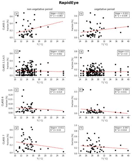 LCZ class fractions [%] computed into the 500 m buffer around the stations versus the measured air temperature at the stations. Air temperature measurements correspond to the hour of the RapidEye imagery acquisition. Acquisition times are 18 March 2016 at 11:14 a.m. GMT (non-vegetative period) and 22 June 2016 (vegetative period) at 10:46 a.m. GMT. Red Lines and text boxes show the results of the linear regression for each plot.