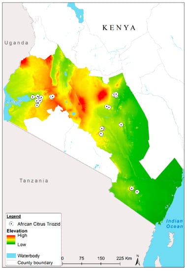 Field surveys were conducted along a clearly defined transect within the citrus-growing regions from the lowlands to the highlands in Kenya. In general, horticultural farming in Kenya is mainly carried out by small-scale producers because of the scarcity of productive land for horticultural production. Thus, citrus is grown in a wide range of elevations ranging from the lowlands to the highlands of Kenya [50]. The study area was divided into three elevation zones: Low (0–500 m. a. m. s. l.), middle (501–1000 m. a. m. s. l.), and high (>1000 m. a. m. s. l.). Each elevation zone was regarded as a stratum; therefore, we followed a stratified random sampling protocol to collect the ACT presence data. In each stratum (i.e., elevation zone), we randomly selected citrus orchards and nurseries, including backyards of small farms with a minimum orchard-to-orchard distance of 2 km for sampling. At least 30 citrus orchards in each stratum were sampled and with the aid of a hand-held Global Positioning System (GPS) device with a positional accuracy of ±2 m, the location of the citrus orchard, nursery, or backyard farm where ACT was present was recorded as an occurrence point. Specifically, for sample citrus orchard and backyard farms ≤ 0.5 ha, all citrus trees were inspected for ACT symptoms, while in orchards > 0.5 ha only 20 randomly selected trees were sampled in each orchard by moving across the orchard in a W-pattern [36]. Presence-only observations (n = 47) were collected across the study area, see Figure 1, between January 2015 and September 2016. This number of presence-only observations is regarded as acceptable in a MaxEnt modeling routine [51,52]. A subset of the ACT presence-only observations was used for training the MaxEnt model (75% of the sample observations), and 25% of the sample observations were used for model evaluation [53]. We also collected information on the representative sample vegetation cover and type surrounding citrus orchards and backyard farms where the ACT was present using geotagged photographs that were taken from the main four cardinal directions of the orchards for further inspection on how the landscape context could affect the presence of ACT.