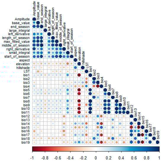 To examine the expected multi-collinearity among the predictor variables, we performed a Pearson correlation test, see Figure 2, between all the predictor variables shown in Table 1. Furthermore, the “Findcorrelation” function in the Caret package in R was used to eliminate highly correlated variables using the mean absolute error score. A correlation coefficient of |r| > 0.7 was set as a collinearity indicator for variables that would severely affect our model [17]. Variables that met this criterion were eliminated from the analysis, and only the uncorrelated predictor variables were used in the MaxEnt model.