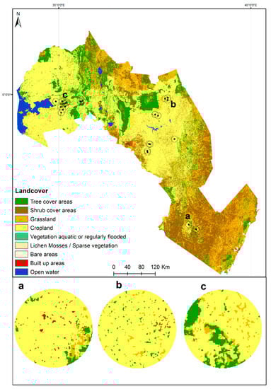 Figure 3. A 20-m spatial resolution land use/land cover map for the study area generated by the Climate Change Initiative (CCI) Land Cover (LC) team. Using yearly Sentinel-2 observations. (ac) represent zoomed buffers of 1500 m radius each around certain representative African citrus triozid (ACT) occurrence points.