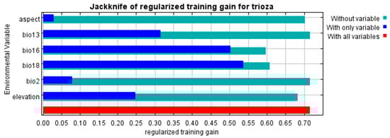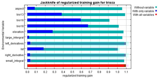 Figure 4 and Figure 5 show the results of the jackknife test of variable importance for the BCL and BCL-RS models, respectively. Blue shades show the individual importance of each variable when used in isolation, while green shows the model performance when the variables are exempted from the model. The figures also show the variables which caused the greatest decreases in the gain when omitted, indicating that they provided a significant portion of information that was not contained in the other variables. For both models (BCL and BCL-RS), the variable with the highest gain (relevance) when used in isolation was Bio 18; therefore, Bio 18 appears to have the most useful information individually, followed by Bio 16 (for variable definitions see Table 1). Likewise, the variables that decreased the gain the most when they were omitted were Bio 16 and Bio 18 for the BCL model and Bio 16 and LST for the BCL-RS model. These variables appear to have the most influence on the models compared to the other variables.