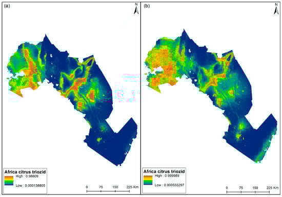 Figure 6. Predicted distribution suitability map for African citrus triozid (Trioza erytreae) using environmental (BCL model) variables (a), and environmental and remotely-sensed (BCL-RS model) variables (b). Blue indicates low distribution suitability, while red represents high distribution suitability.