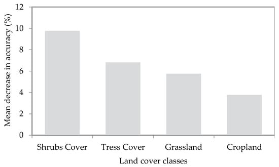 We realized that there are diverse and multiscale responses of landscape context (i.e., LULC) to the habitat suitability of ACT. Using the mean decrease in accuracy (%) in the RF variable importance rank, the “shrubs” class was found to be the most relevant LULC class to ACT habitat suitability followed by “trees”, “grassland”, and “cropland”, respectively, as shown in Figure 7.