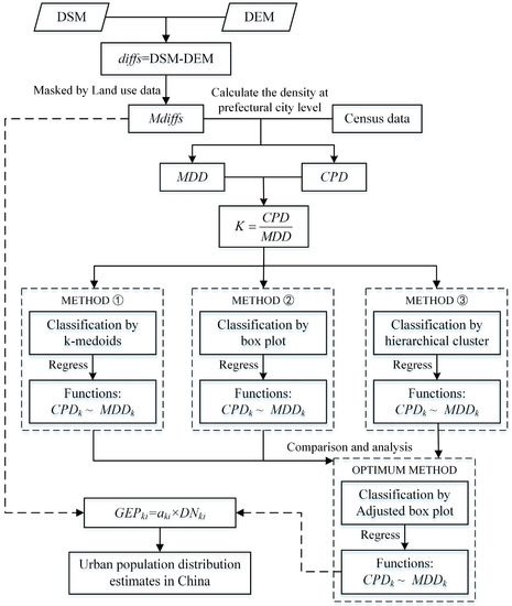It can be concluded that high-resolution height data can be well used to estimate the total or spatial pattern of the urban population for small study areas, e.g., the downtown area of a city or a community. However, there is a lack of evidence as to whether height data can be used to estimate the total urban population of large areas. In this paper, height data was used to estimate the urban population of prefectural cities in China. The building height in urban areas was first obtained according to the DSM and DEM datasets. Next, three algorithms were used to classify the whole search area, and then regression models between the census population density and total building height were built and analyzed for the prefectural cities. By comparing the regression results and through comprehensive analysis, an optimum classification algorithm was developed. Subsequently, the population of China was estimated using the regression models from the optimum classification algorithm, and the results were finally compared with the census population.