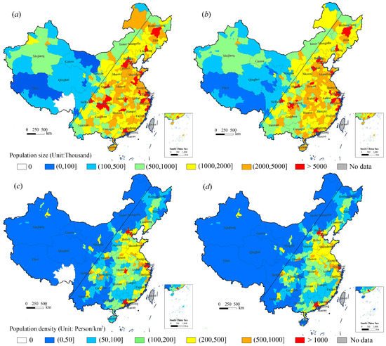 Distribution of the urban estimation and census population at the prefectural city level. (a) Estimated urban population size. (b) Census urban population size. (c) Estimated urban population density. (d) Census urban population density.