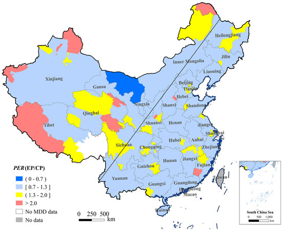 Table 5 shows the number and percentage of cities in each PER range for region k. Generally, the number of cities with a PER between 0.7 and 1.3 reached 100% when k = 2, 3, 5. There were few cities overestimated in categories 1 and 4.