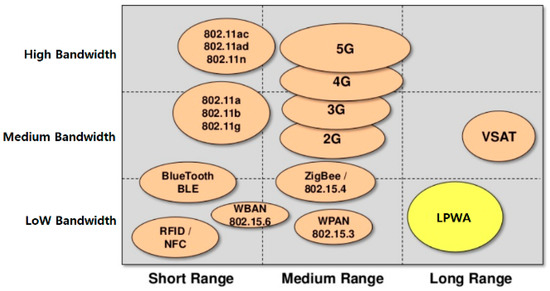 In recent years, the number of Internet of Things (IoT) devices has increased exponentially with the decreasing costs of hardware and communication technologies [1]. IoT devices need to communicate with each other to transmit data packets among themselves. Medium- and long-range IoT devices use both cellular- and noncellular-based communication technologies. Low-power wide-area (LPWA) communication, a noncellular-based communication technology, allows long-range communication among IoT devices with low power consumption and cost. Thus, LPWA communication is highly suitable for long-range wireless IoT devices despite its low bandwidth constraint. Figure 1 shows a comparison of common communication technologies including LPWA.