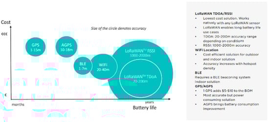 The LoRa Alliance released a Long-Range Wide Area Network (LoRaWAN) geolocation whitepaper. LoRaWAN uses the LoRa spectrum modulation method. Its system architecture and communication protocol influence battery life, network capacity, quality of service, security, and so on [5]. The whitepaper compared the cost, battery life, and positioning accuracy of GPS/assisted GPS (AGPS), Bluetooth Low Energy (BLE), Wi-Fi, and LoRaWAN. GPS/AGPS, BLE, and Wi-Fi were found to consume more power than LoRaWAN. The whitepaper also compared the LoRaWAN received signal strength indicator (RSSI) proximity and LoRaWAN time difference of arrival (TDoA) methods, as shown in Figure 2.