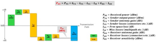 As shown in Figure 3, the link budget is the sum of signal power gains and losses from the transmitter to the receiver through a medium such as free air space, cable, waveguide, or optical fiber. The RSSI value is a measure of the received signal power [14].