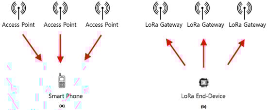 Smartphones receive downlink signals from access points for the positioning in Wi-Fi networks as shown in Figure 5a. Figure 5b shows that LoRa uplink signals are transmitted from an end-device to gateways and not vice versa, and therefore, only the owner of the LoRa network can access LoRa signal strength information. As a result, few studies have investigated positioning methods that used the fingerprint of LoRa RSSI.