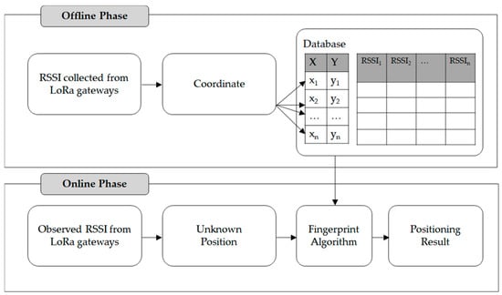 In this study, the LoRa-based positioning process using a fingerprint algorithm consisted of an online and an offline phase, as shown in Figure 6. In the offline phase, RSSI values of LoRa signals are measured and stored for each randomly selected sample point within the test area. In the online phase, the location of an end-device is estimated for arbitrary unknown locations.