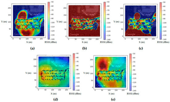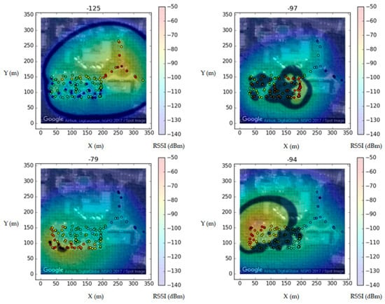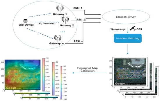 A LoRa end-device transmits signals to several gateways simultaneously. Each signal includes an ID, timestamp, and GPS coordinates. GPS coordinates can be measured using the end-device or using external devices. Each gateway measures the intensity of the signals from end-devices. The measured RSSI values are then sent to the positioning server and stored with their corresponding GPS coordinates. When sample points are visualized with their RSSI values for each gateway, the results are represented on a map, as shown in the lower right part of Figure 7. The fingerprint maps (i.e., interpolated results) are represented as heat maps, as shown in the lower left part of Figure 7.