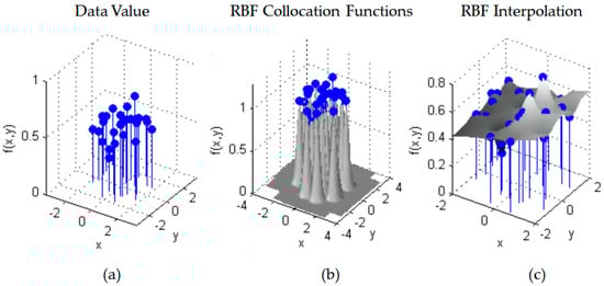 Interpolation of f(x,y) using Gaussian RBF with 25 sample points: (a) Random data points. (b) the RBF centered at the collocation points (c) shows the interpolated surface [21].