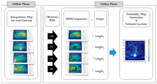 The RSSI value of an end-device is compared to the value of each fingerprint map. Then, candidate regions are filtered and extracted for each fingerprint map. We combine these extracted regions with a weighting factor to create a probability map. The results of the probability map vary according to the weight assigned to the filtered grids for each gateway. We conducted experiments on three types of weighting factors. Figure 10 shows the probability map generation process.