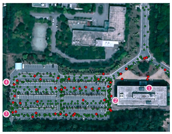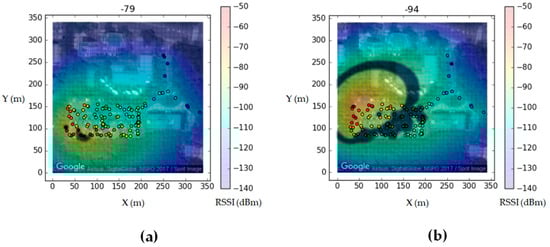 We set up the 340 m × 340 m experimental area as shown in Figure 14. We installed four gateways equipped with Semtech Corporations’ SX1276 chipsets. The training and test datasets were collected separately in the same area. When the fingerprint maps were generated for each gateway, the test dataset was excluded. In total, 340 × 340 = 115,600 grid cells with 1 m × 1 m resolution were constructed for the test. We fixed the LoRa spreading factor as 7.