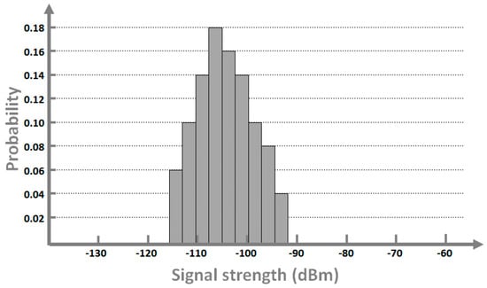 We needed to create a buffer to extract candidate regions in the interpolation map, as shown in Figure 11, because of the unstable feature in the LoRa RF signals. The radio frequency (RF) signal strength fluctuates slightly over time, as shown in Figure 12. After we observed the signal strength distribution in the online phase, we assigned a 3 dBm buffer for the selection of candidate regions to include the actual location in the candidate region. For example, for −79 dBm RSSI in gateway 3, we set the candidate region as that in which RSSI was −82 to −76 dBm. We also tested varying buffer values for each signal and gateway. This buffer dBm could be changed depending on the training data.