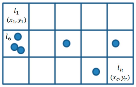 We use a probabilistic method based on the Bayesian inference method [12,22] using the observed RSSI data to compute the conditional probability for positioning. We define grids for the experimental area, and we assign indexes from to for each grid cell, as shown in Figure 13. We constructed an experimental area of 340 × 340 cells, and the resolution of each cell was set to 1 m × 1 m. Then, we define as a set of locations with x, y coordinates as given by Equation (1).