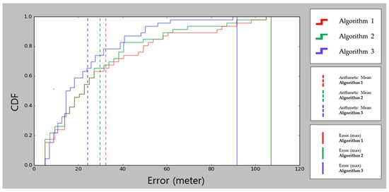 Figure 15 shows the cumulative probability distribution of errors for each algorithm, where the X-axis represents the error in meters and the Y-axis, the cumulative distribution function. Algorithms 1–3 are represented by red, green, and blue lines, respectively. Dashed lines indicate the average error over all test points for each algorithm. The solid vertical lines near 100 m indicate the maximum estimation errors. As seen in Table 2, Algorithm 1 (red) and Algorithm 2 (green) both showed maximum estimation errors of 107.7 m for sample point 18, and Algorithm 3 showed maximum estimation error of 91.7 m for sample point 15.