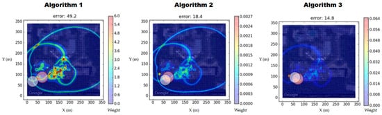 Three different algorithms were applied to the probability map generation process. Algorithm 1 calculates the extracted candidate regions with the same weight factor. Algorithm 2 normalizes the weighting factors with the area of each region. Algorithm 3 calculates the factor by applying Equation (6); in this case, a higher weight is assigned to a stronger signal.