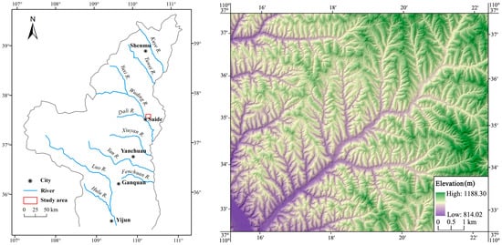 The Jiuyuangou region of the Loess Plateau in the northern Shaanxi Province, China, is selected as the study area for the current study, as shown in Figure 1. The case study site is located in the middle reach of the Wuding River and its topography consists of loess hilly-gully landforms featured with severe erosion, fully developed gullies and broken terrain. The site covers about 100 km2 of area and the relative altitude difference from hill top to gully bottom is 374 m, ranging from 814 to 1188 m. The average ground surface slope is 29°, and the density of gullies is 6.52 km/km2. A digital elevation model (DEM) of 5 m resolution is available from the National Fundamental Geographic Information Database to support the current study.